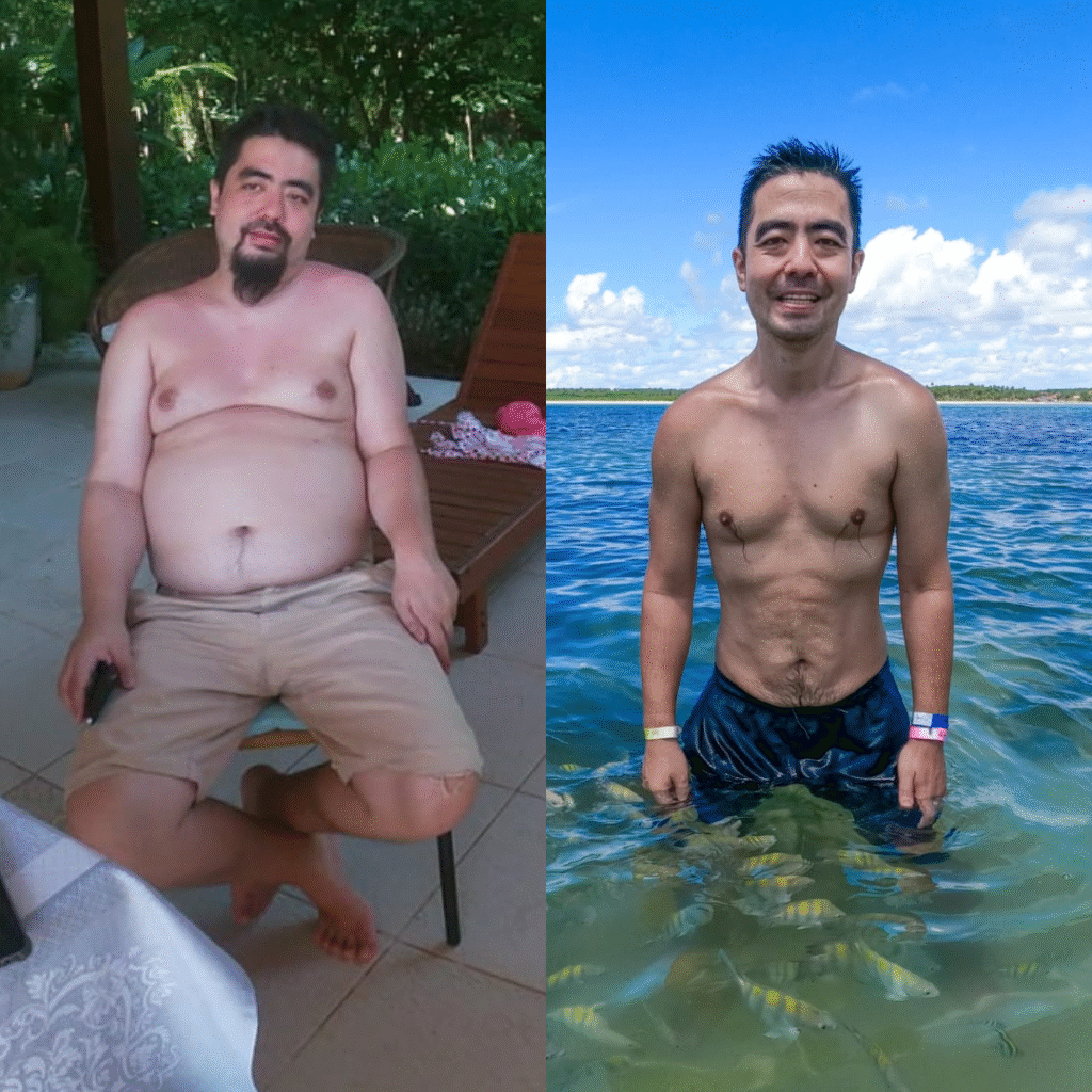 Bruno é psiquiatra, tem 42 anos e esposo da Carol Giubbina. Durante a pandemia chegou ao maior peso da vida, 108 kg, sem energia e disposição. Depois de várias tentativas, conseguiu mudar e eliminou 33 kg. Hoje pesa 75 kg e passou do GG para o P.